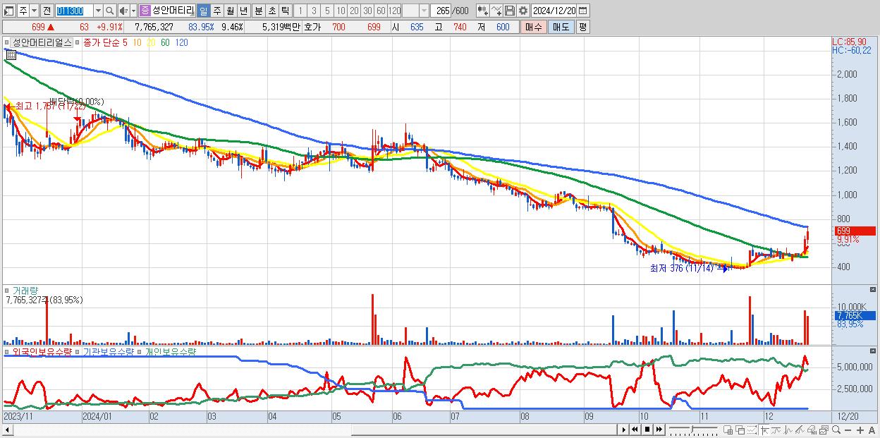 - 성안머티리얼스 (699원 ▲ 9.91% , 시총: 574억, 거래량: 7,765,327, 거래대금:53억)