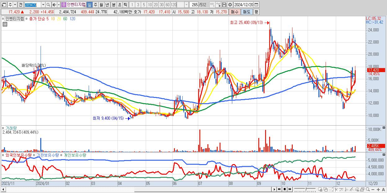 - 인벤티지랩 (17,420원 ▲ 14.45% , 시총: 1,748억, 거래량: 2,484,724, 거래대금:422억)