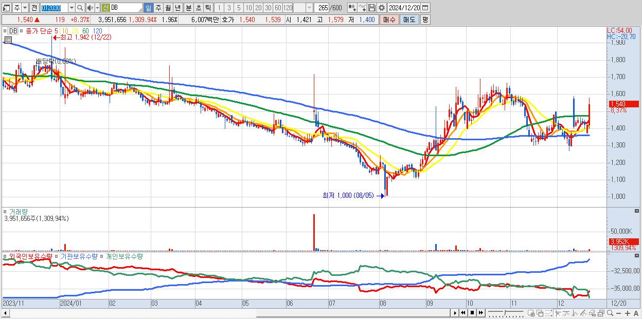- DB (1,540원 ▲ 8.37% , 시총: 3,098억, 거래량: 3,951,656, 거래대금:60억)