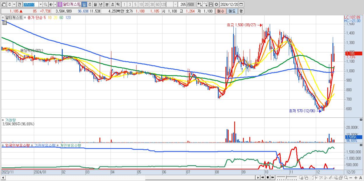 - 알티캐스트 (1,185원 ▲ 7.73% , 시총: 368억, 거래량: 3,584,989, 거래대금:43억)