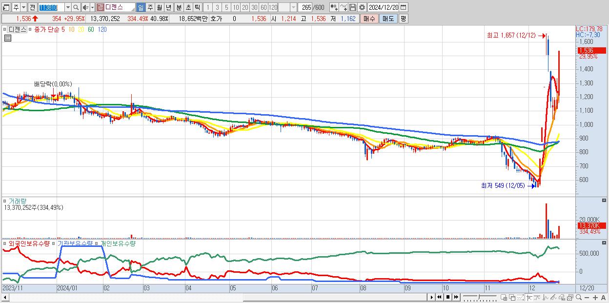 - 디젠스 (1,536원 ▲ 29.95% , 시총: 501억, 거래량: 13,370,252, 거래대금:187억)