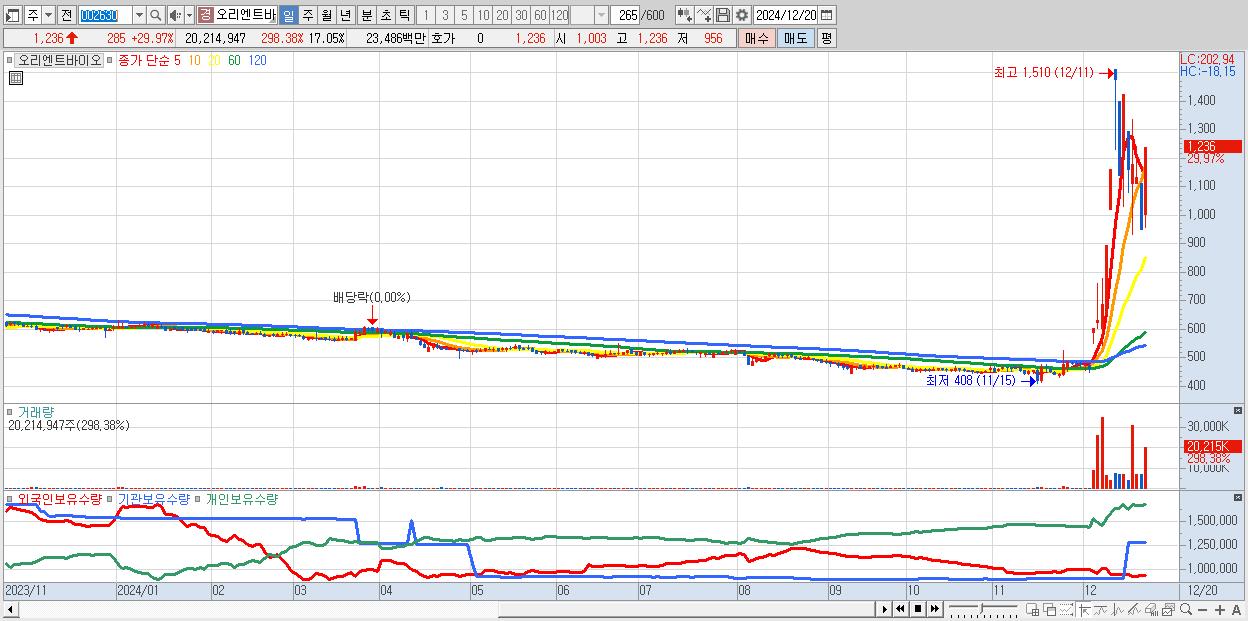 2.오리엔트바이오 1,236원 ▲ 29.97% (KOSPI, 002630)