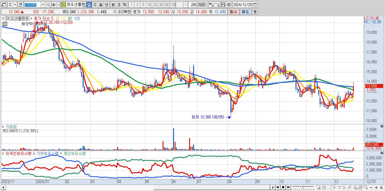 - SK오션플랜트 (13,540원 ▲ 7.29% , 시총: 8,015억, 거래량: 853,040, 거래대금:116억)