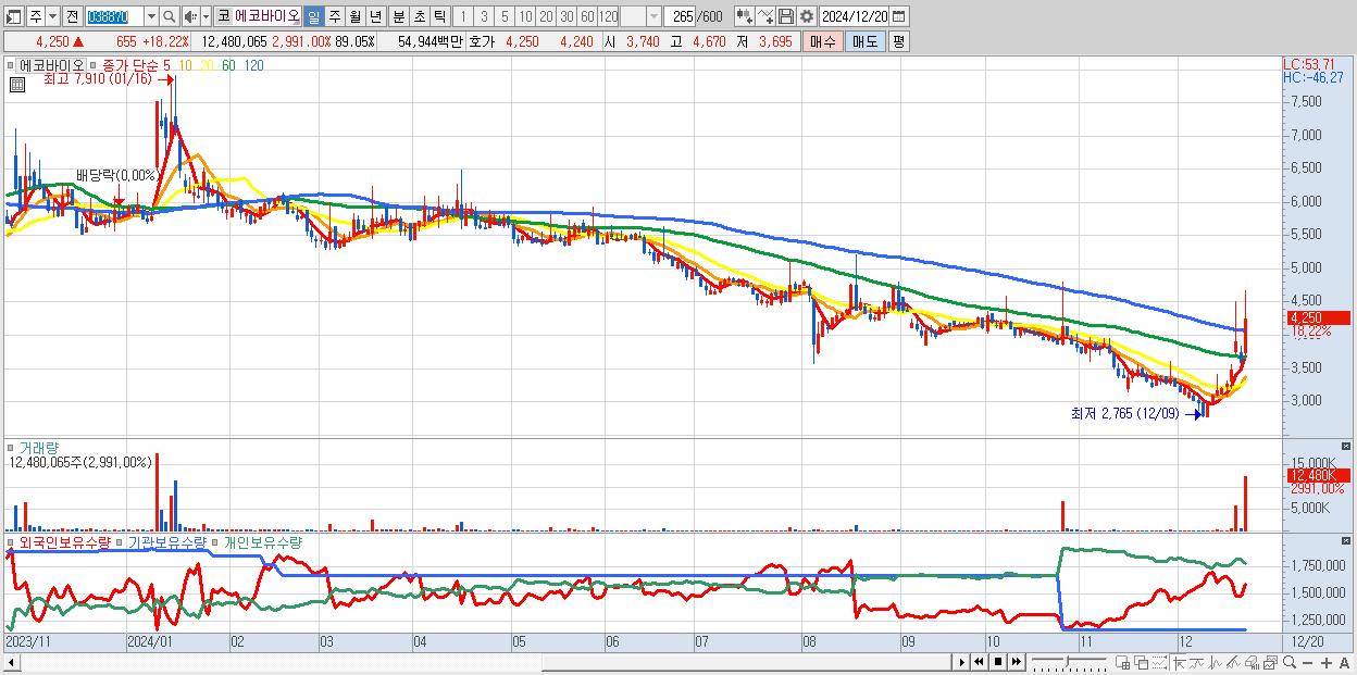 - 에코바이오 (4,250원 ▲ 18.22% , 시총: 596억, 거래량: 12,480,065, 거래대금:549억)