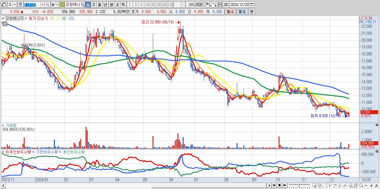 - 강원에너지 (9,550원 ▲ 6.82% , 시총: 2,495억, 거래량: 554,989, 거래대금:53억)