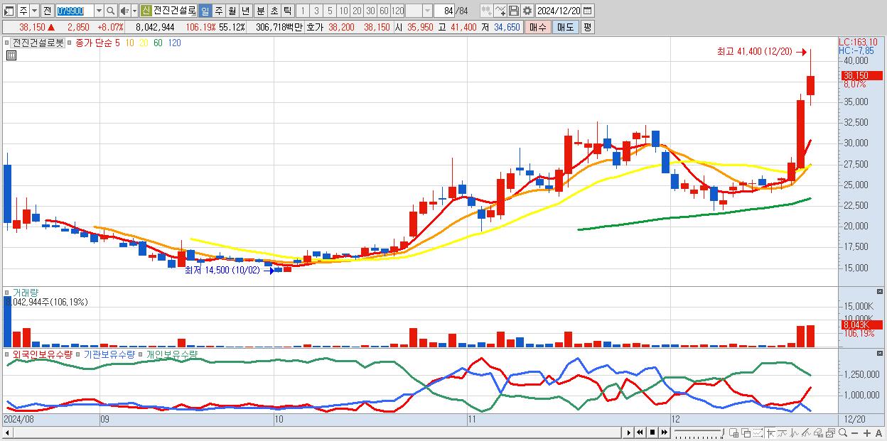 - 전진건설로봇 (38,150원 ▲ 8.07% , 시총: 5,567억, 거래량: 8,042,944, 거래대금:3,067억)