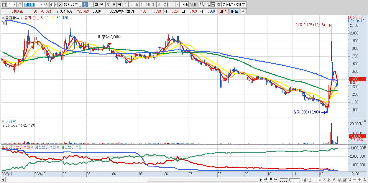 - 동원금속 (1,400원 ▲ 6.87% , 시총: 655억, 거래량: 7,334,502, 거래대금:103억)