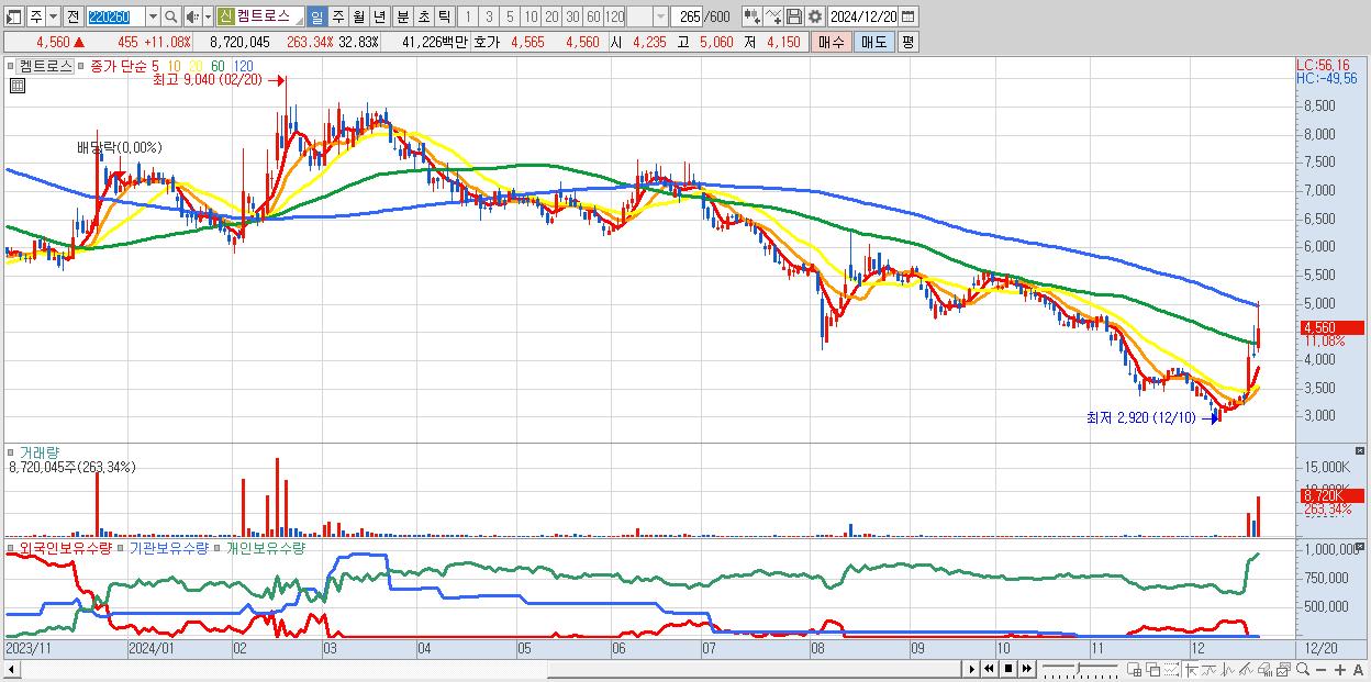 - 켐트로스 (4,560원 ▲ 11.08% , 시총: 1,211억, 거래량: 8,720,045, 거래대금:412억)
