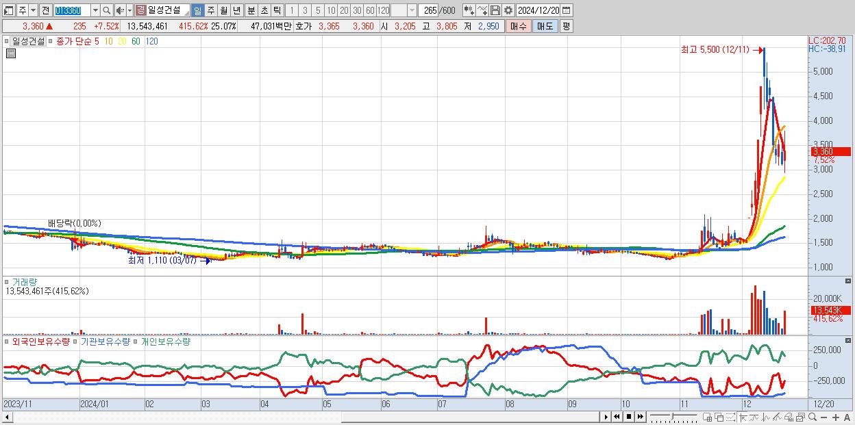 - 일성건설 (3,360원 ▲ 7.52% , 시총: 1,815억, 거래량: 13,543,461, 거래대금:470억)