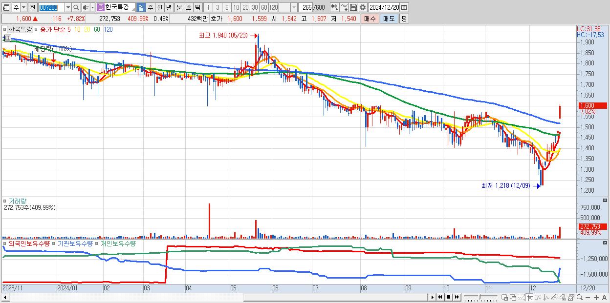 - 한국특강 (1,600원 ▲ 7.82% , 시총: 973억, 거래량: 272,753, 거래대금:4억)