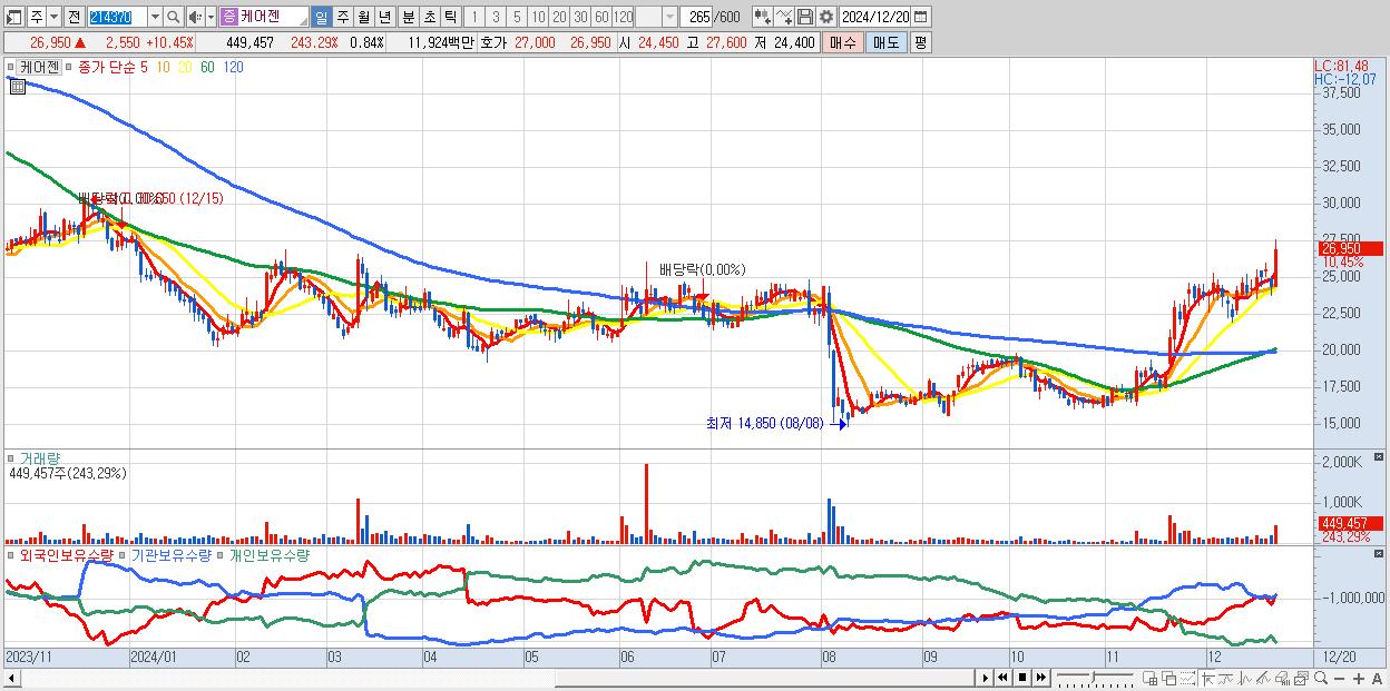- 케어젠 (26,950원 ▲ 10.45% , 시총: 14,476억, 거래량: 449,457, 거래대금:119억)