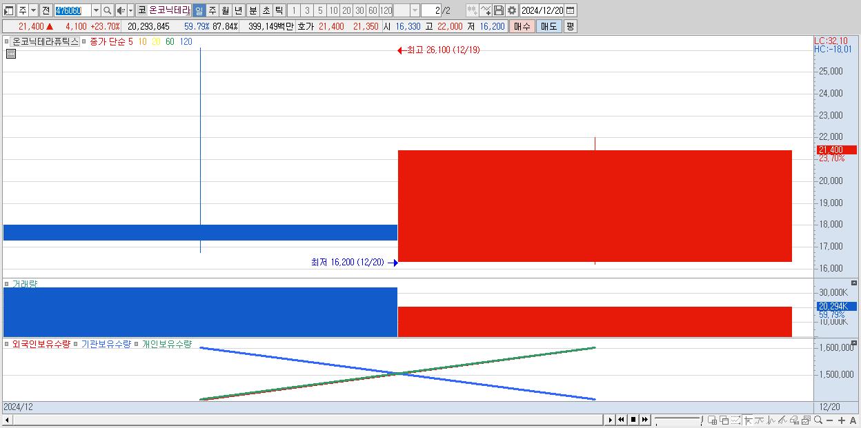 - 온코닉테라퓨틱스 (21,400원 ▲ 23.7% , 시총: 2,312억, 거래량: 20,293,845, 거래대금:3,991억)