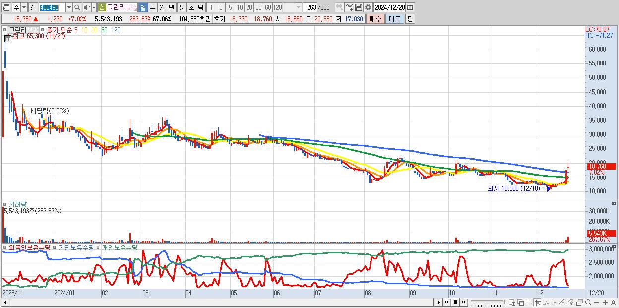- 그린리소스 (18,760원 ▲ 7.02% , 시총: 1,551억, 거래량: 5,543,193, 거래대금:1,046억)