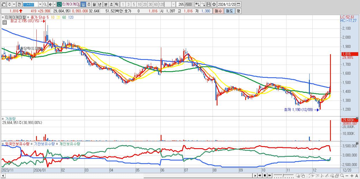 - 티케이케미칼 (1,816원 ▲ 29.99% , 시총: 1,651억, 거래량: 29,664,951, 거래대금:515억)