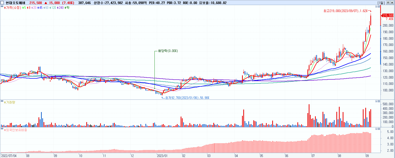 - 현대오토에버 (215,500원 ▲ 7.48% , 시총: 59,099억, 거래량: 389,952, 거래대금:824억, KOSPI)