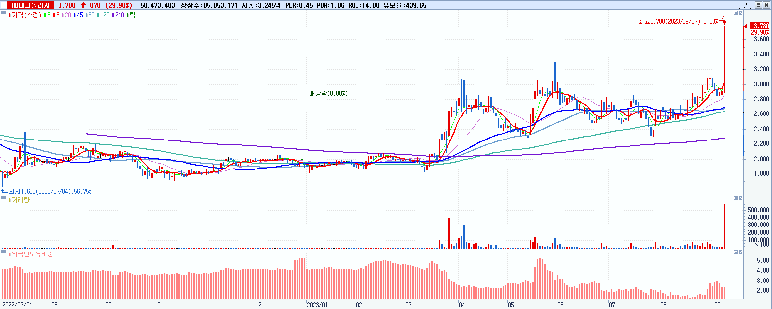 HB테크놀러지 3,780원 ▲ 29.9% (KOSDAQ, 078150)