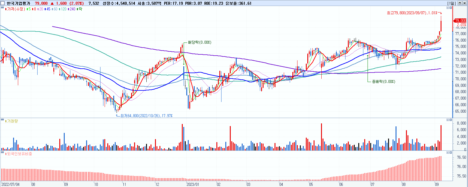 - 한국기업평가 (79,000원 ▲ 2.07% , 시총: 3,587억, 거래량: 7,538, 거래대금:6억, KOSDAQ)