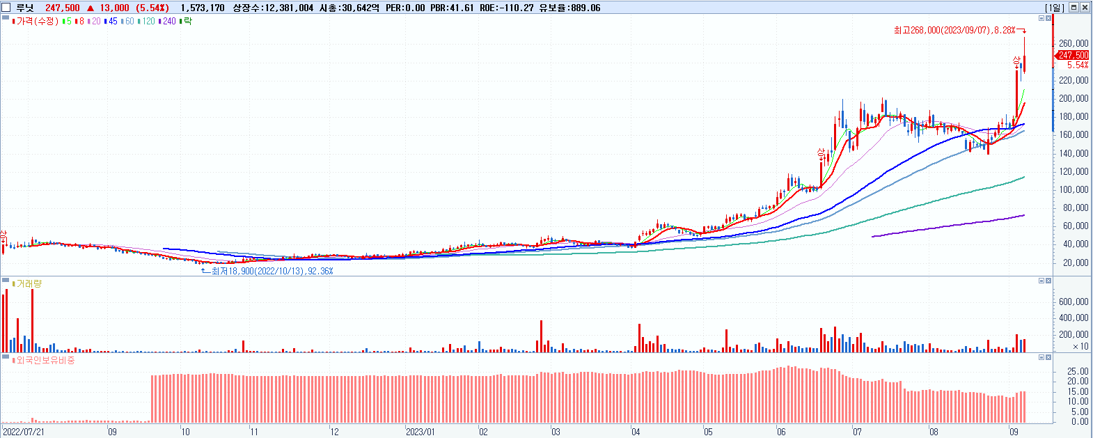 - 루닛 (247,500원 ▲ 5.54% , 시총: 30,643억, 거래량: 1,579,901, 거래대금:3,889억, KOSDAQ)