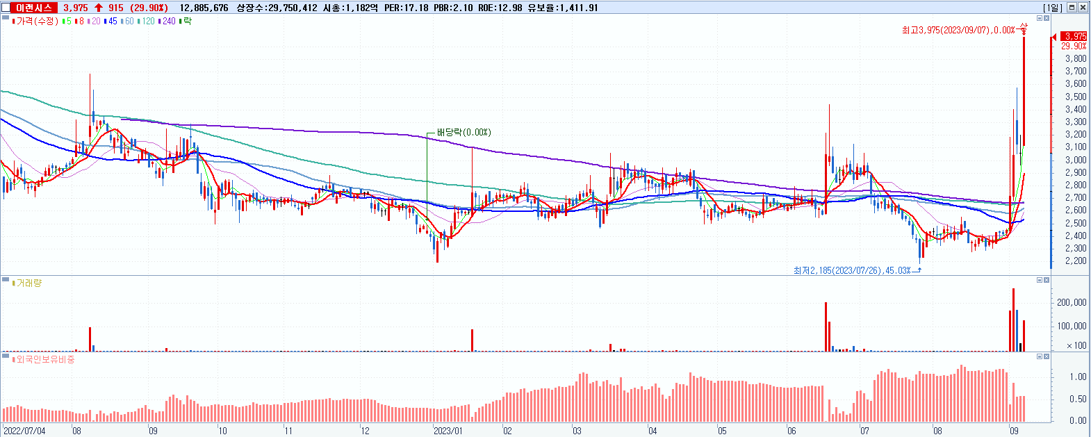 이랜시스 3,975원 ▲ 29.9% (KOSDAQ, 264850)