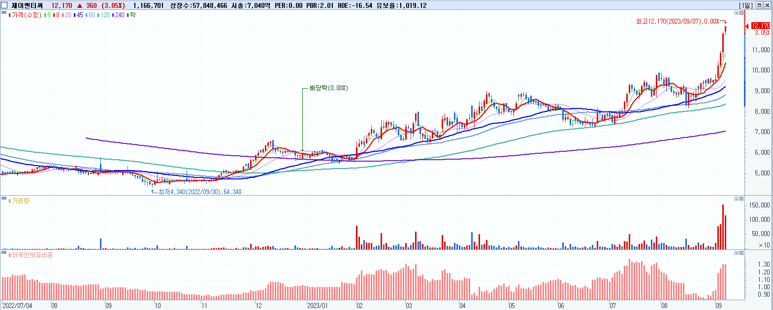 - 제이앤티씨 (12,170원 ▲ 3.05% , 시총: 7,040억, 거래량: 1,179,595, 거래대금:141억, KOSDAQ)
