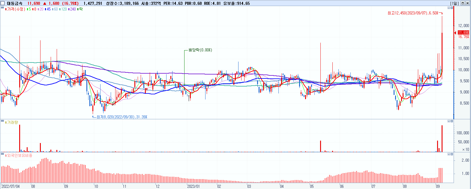 - 대동금속 (11,690원 ▲ 16.78% , 시총: 373억, 거래량: 1,447,978, 거래대금:166억, KOSDAQ)