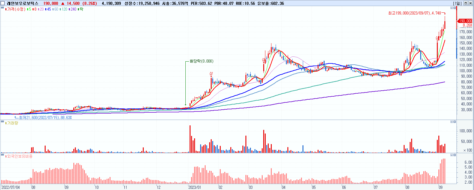 - 레인보우로보틱스 (190,000원 ▲ 8.26% , 시총: 36,577억, 거래량: 4,218,091, 거래대금:7,951억, KOSDAQ)
