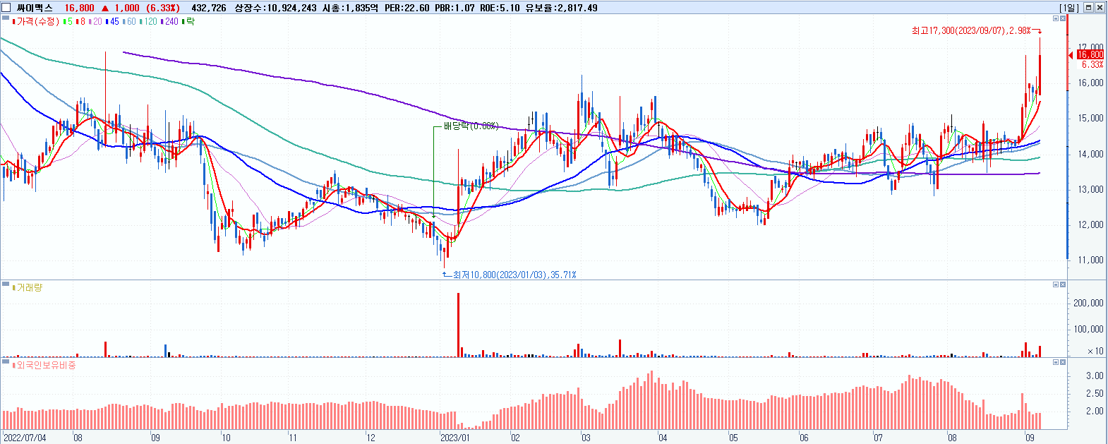 - 싸이맥스 (16,800원 ▲ 6.33% , 시총: 1,835억, 거래량: 439,372, 거래대금:73억, KOSDAQ)