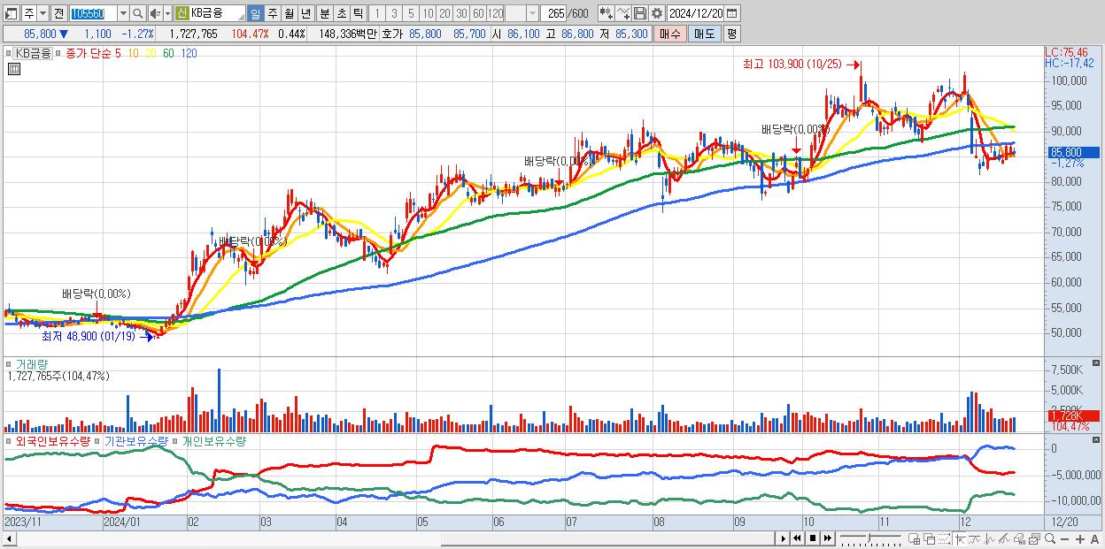 - KB금융 (85,800원 ▼ -1.27% , 시총: 337,647억, 외국인 순매수 거래금:105억)
