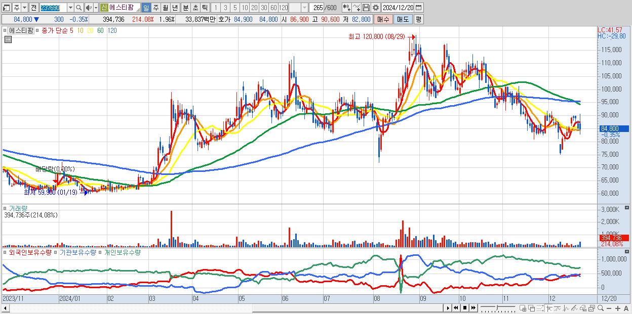 - 에스티팜 (84,800원 ▼ -0.35% , 시총: 17,075억, 외국인 순매수 거래금:38억)