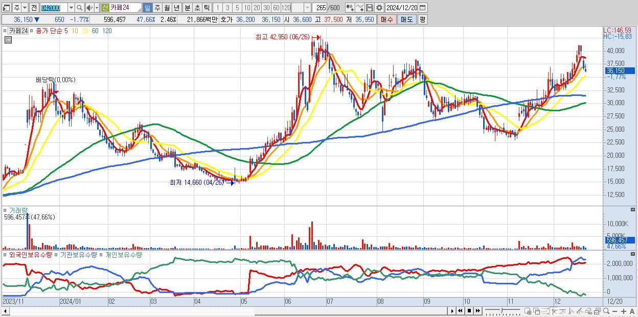 - 카페24 (36,150원 ▼ -1.77% , 시총: 8,767억, 외국인 순매수 거래금:27억)