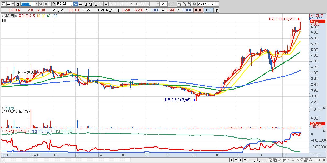 - 유엔젤 (6,230원 ▲ 4.88% , 시총: 822억, 거래량: 293,328, 거래대금:18억, KOSPI)