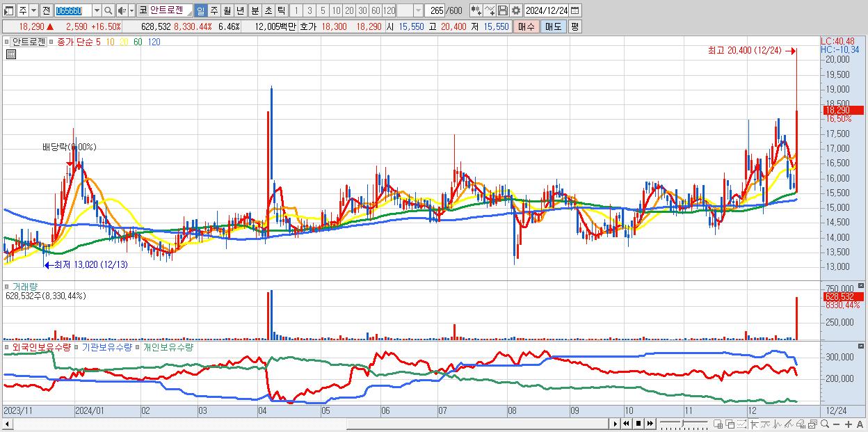 - 안트로젠 (18,290원 ▲ 16.5% , 시총: 1,780억, 거래량: 628,532, 거래대금:120억)