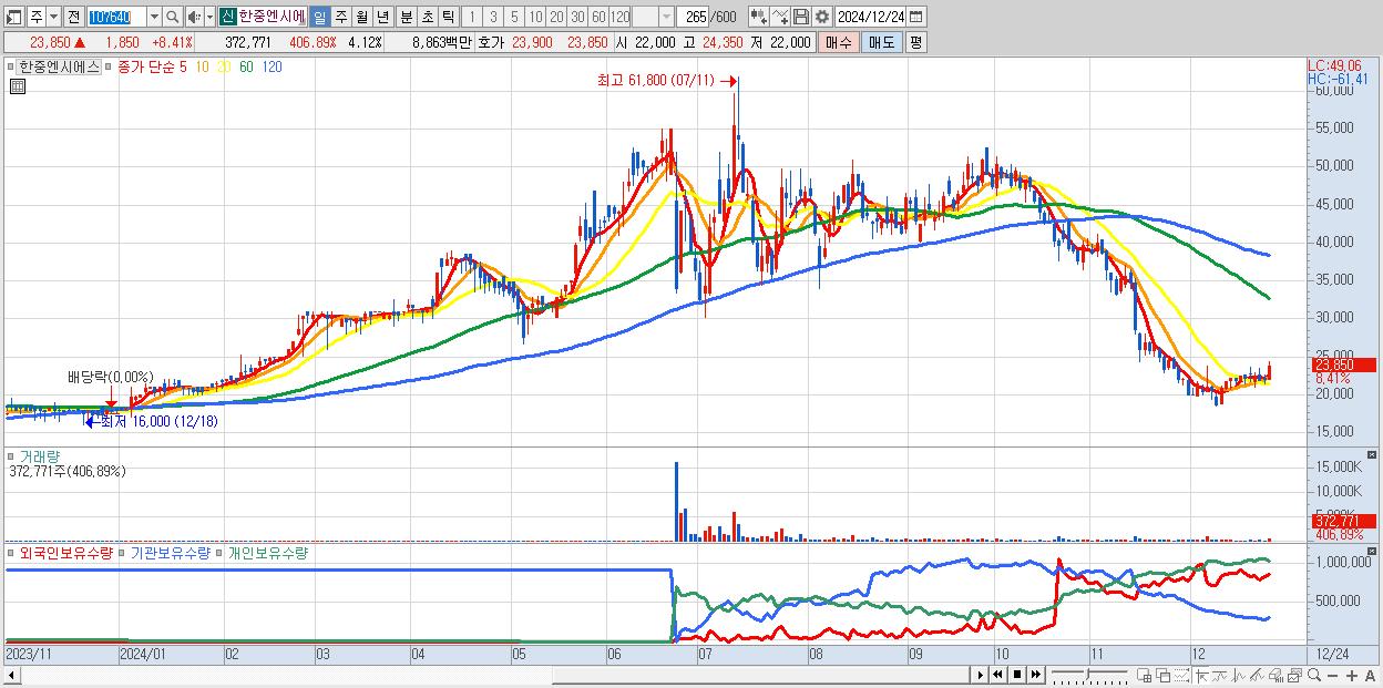 - 한중엔시에스 (23,850원 ▲ 8.41% , 시총: 2,158억, 거래량: 372,771, 거래대금:89억)