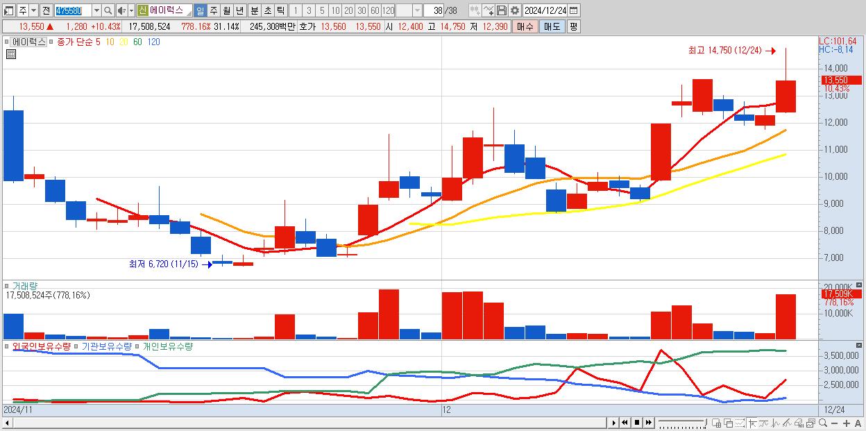 - 에이럭스 (13,550원 ▲ 10.43% , 시총: 1,809억, 거래량: 17,508,524, 거래대금:2,453억)