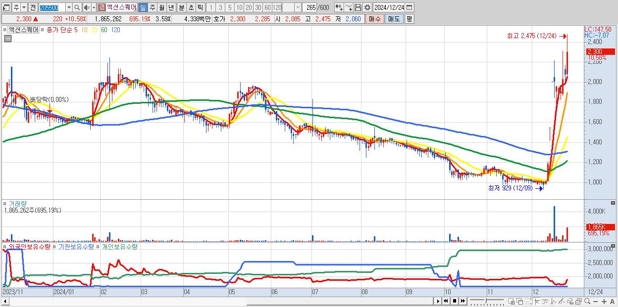 - 액션스퀘어 (2,300원 ▲ 10.58% , 시총: 1,194억, 거래량: 1,865,262, 거래대금:43억)