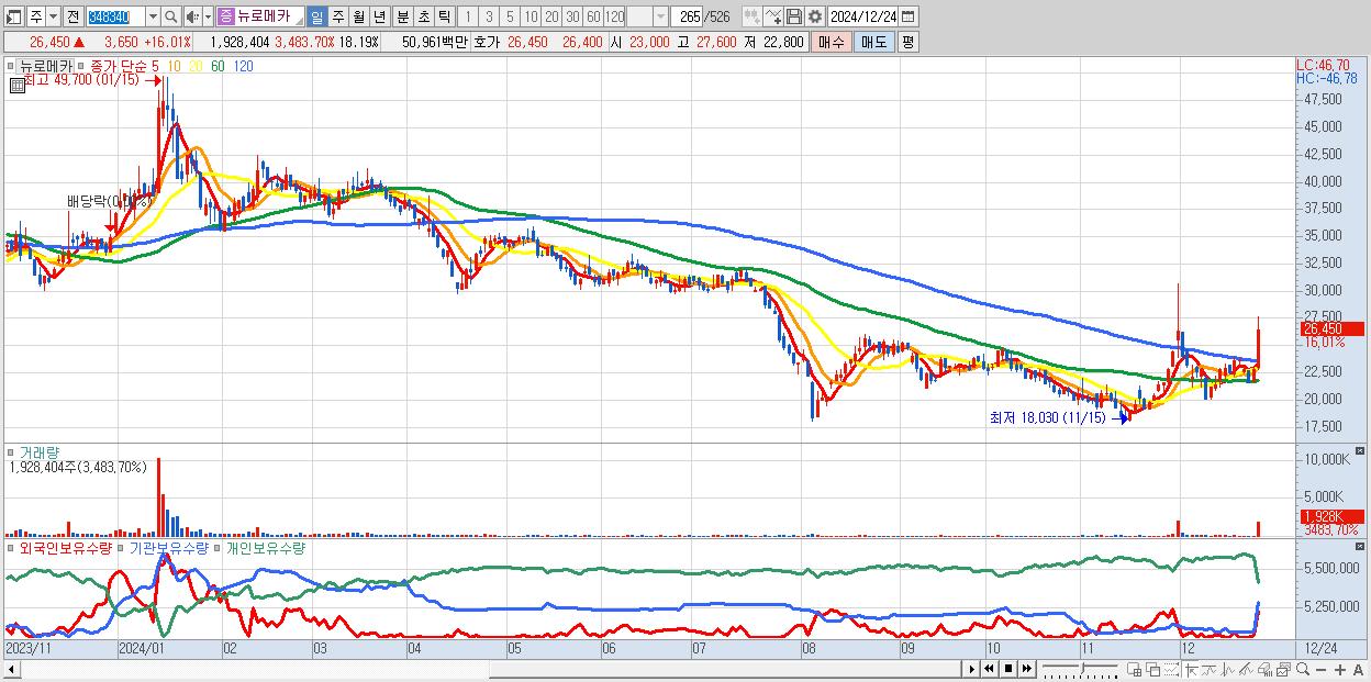 - 뉴로메카 (26,450원 ▲ 16.01% , 시총: 2,804억, 거래량: 1,928,404, 거래대금:510억)