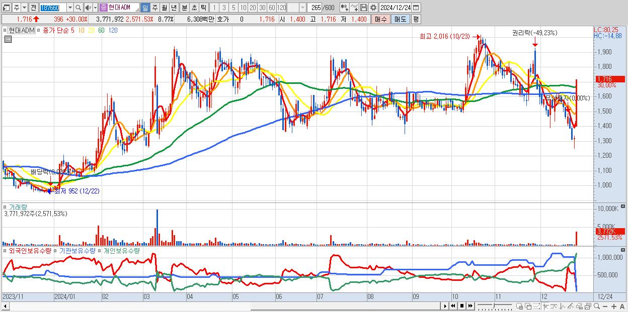 - 현대ADM (1,716원 ▲ 30% , 시총: 738억, 거래량: 3,771,972, 거래대금:63억)