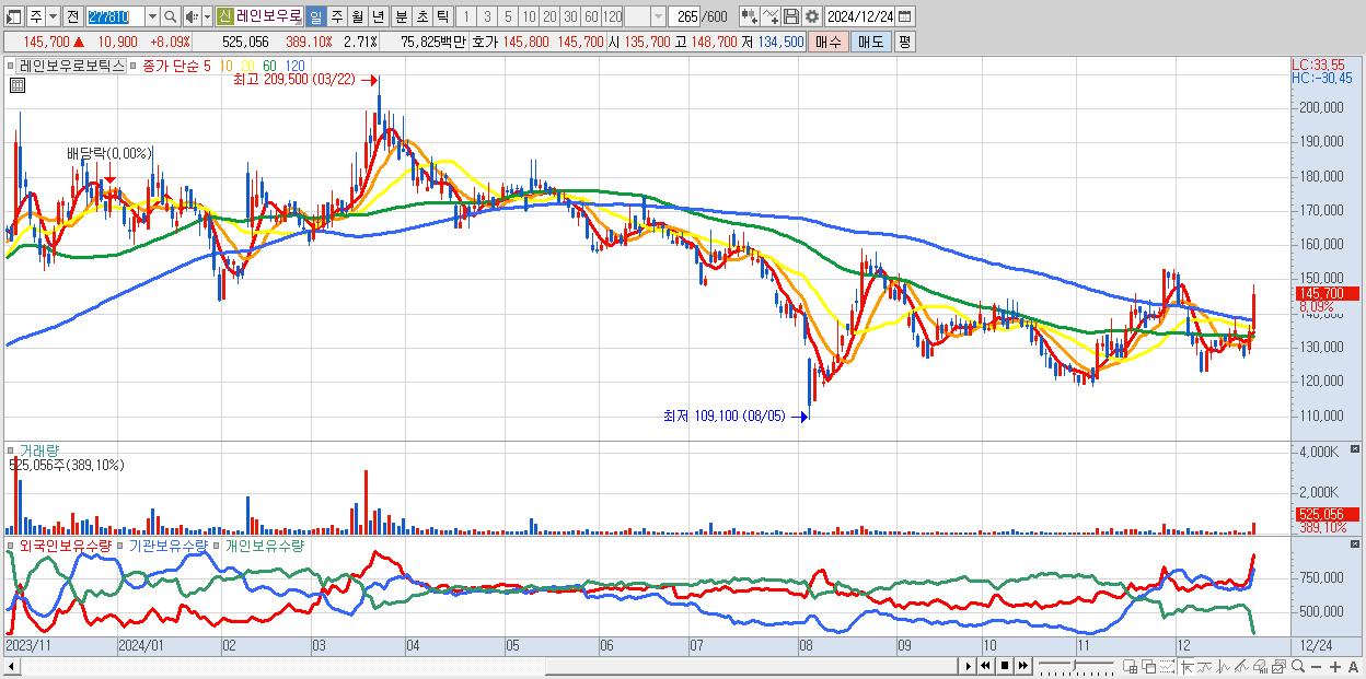 - 레인보우로보틱스 (145,700원 ▲ 8.09% , 시총: 28,266억, 거래량: 525,056, 거래대금:758억)