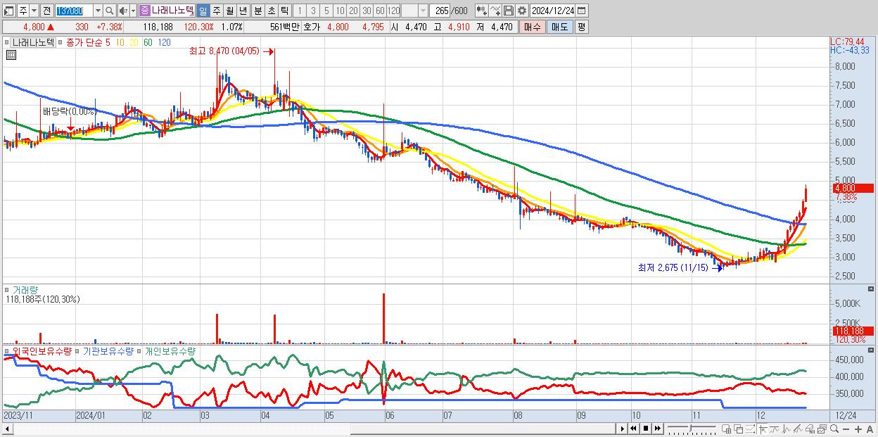 - 나래나노텍 (4,800원 ▲ 7.38% , 시총: 531억, 거래량: 118,188, 거래대금:6억)