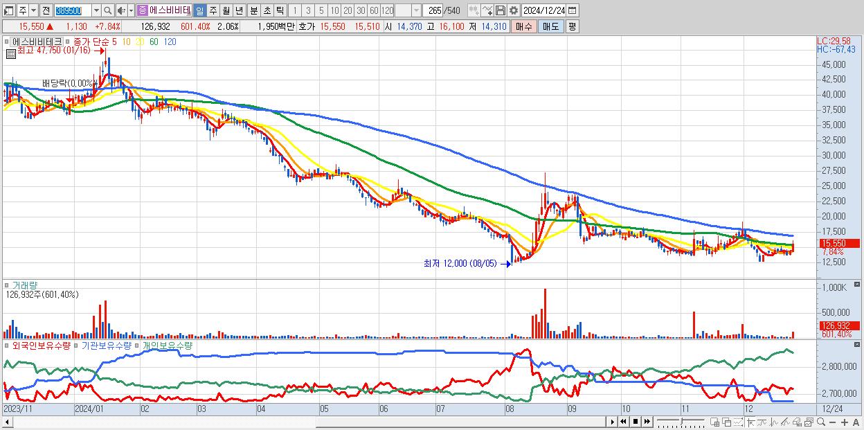 - 에스비비테크 (15,550원 ▲ 7.84% , 시총: 960억, 거래량: 126,932, 거래대금:20억)