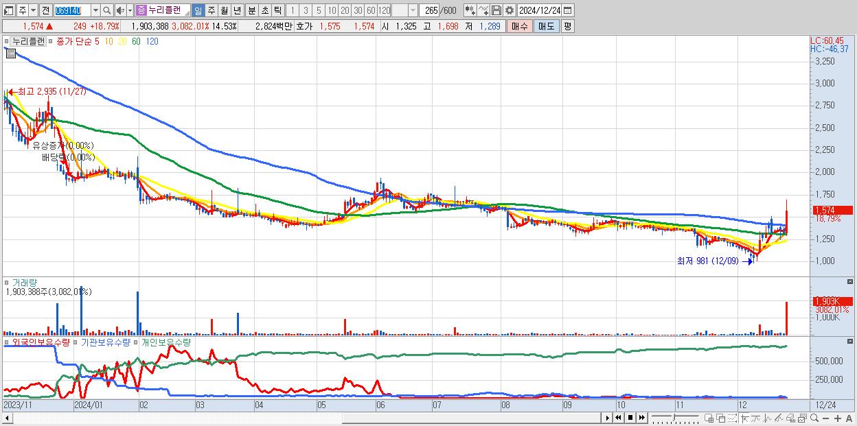 - 누리플랜 (1,574원 ▲ 18.79% , 시총: 206억, 거래량: 1,903,388, 거래대금:28억)