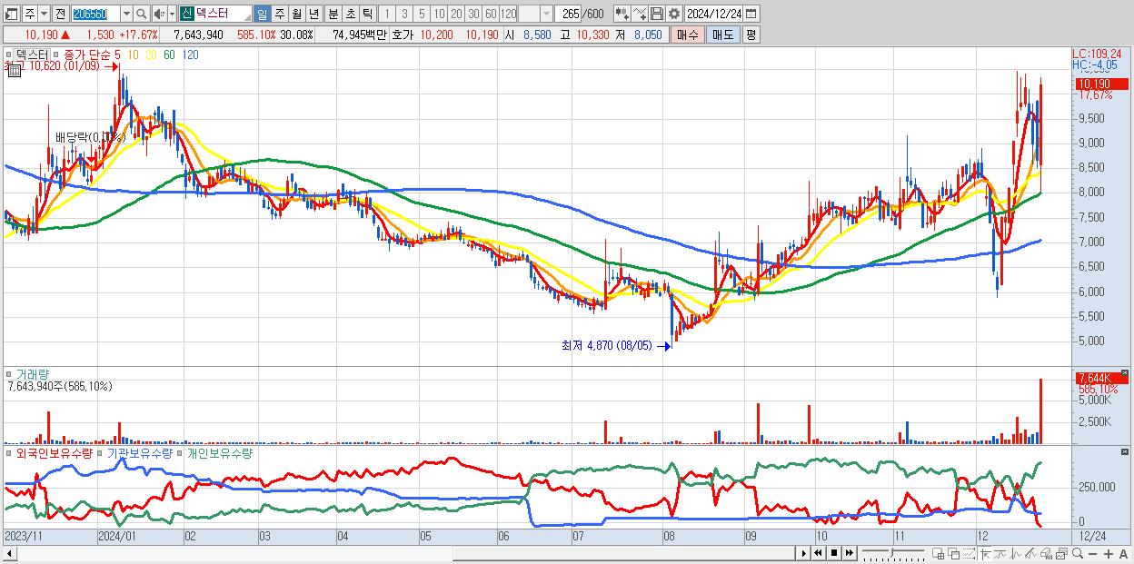- 덱스터 (10,190원 ▲ 17.67% , 시총: 2,589억, 거래량: 7,643,940, 거래대금:749억)