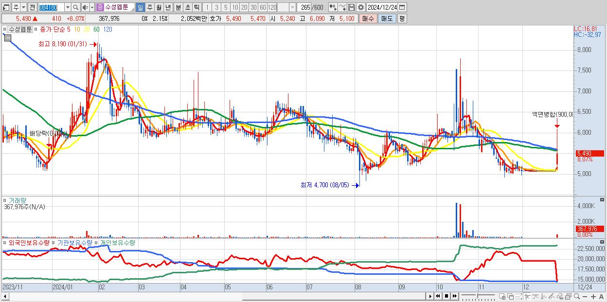 - 수성웹툰 (5,490원 ▲ 8.07% , 시총: 941억, 거래량: 367,976, 거래대금:21억)