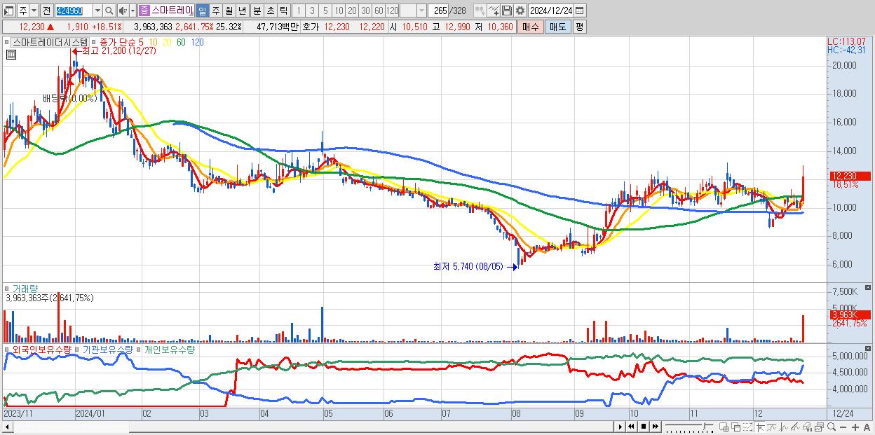- 스마트레이더시스템 (12,230원 ▲ 18.51% , 시총: 1,914억, 거래량: 3,963,363, 거래대금:477억)