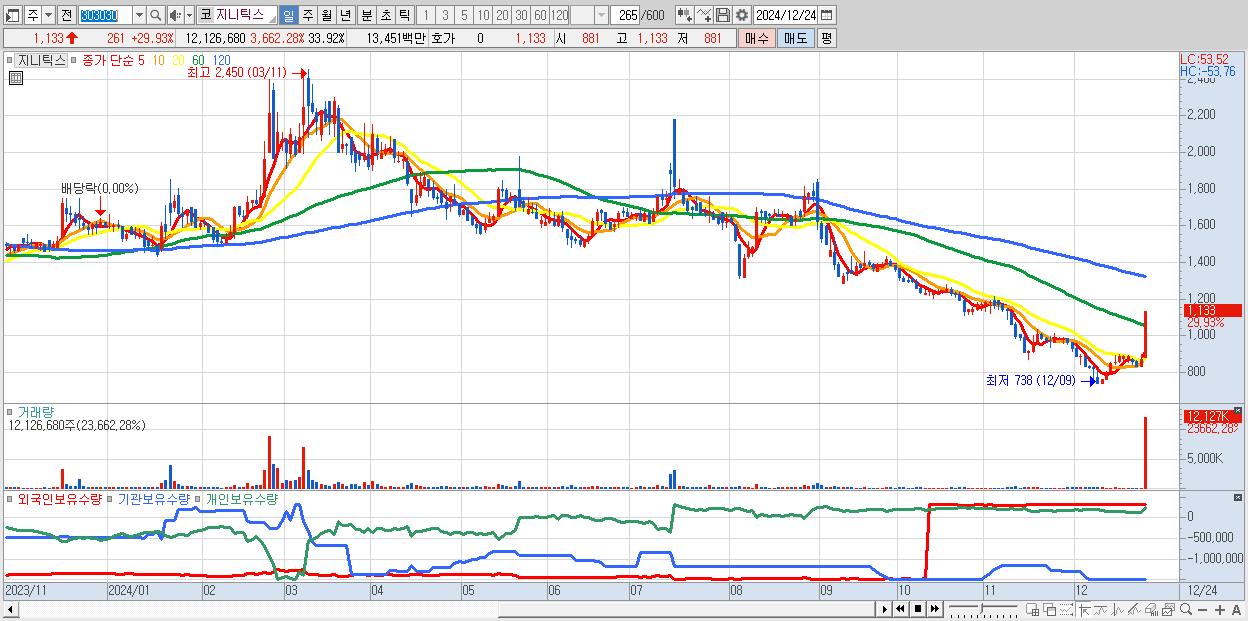 - 지니틱스 (1,133원 ▲ 29.93% , 시총: 405억, 거래량: 12,126,680, 거래대금:135억)