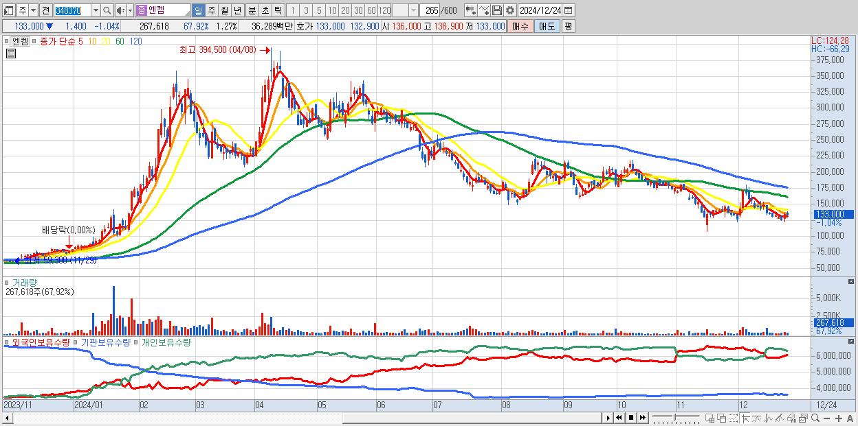 - 엔켐 (133,000원 ▼ -1.04% , 시총: 28,077억, 외국인 순매수 거래금:33억)
