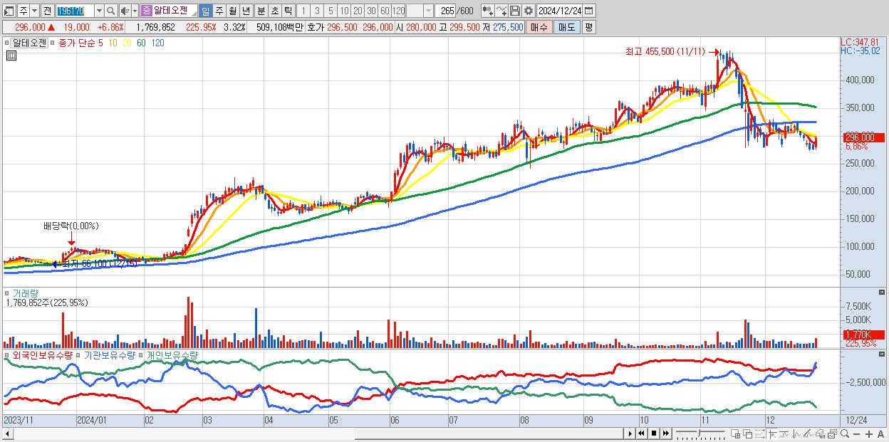 - 알테오젠 (296,000원 ▲ 6.86% , 시총: 157,824억, 외국인 순매수 거래금:241억)