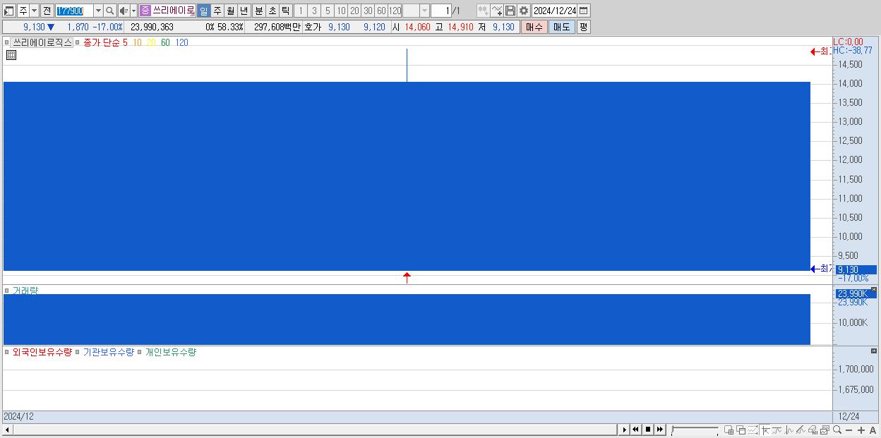 - 쓰리에이로직스 (9,130원 ▼ -17% , 시총: 848억, 거래량: 23,990,363, 거래대금:2,976억)