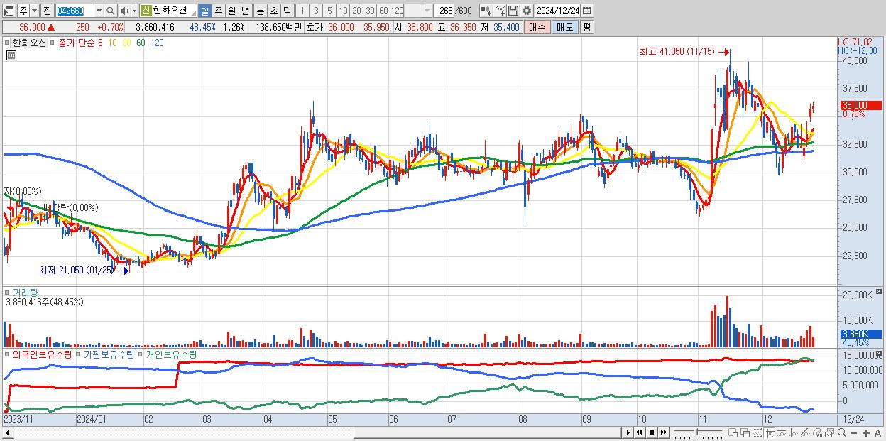 - 한화오션 (36,000원 ▲ 0.7% , 시총: 110,309억, 거래량: 3,860,416, 거래대금:1,386억)