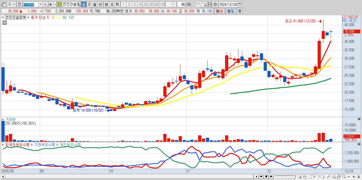 - 전진건설로봇 (38,000원 ▲ 2.7% , 시총: 5,545억, 거래량: 2,291,098, 거래대금:862억)